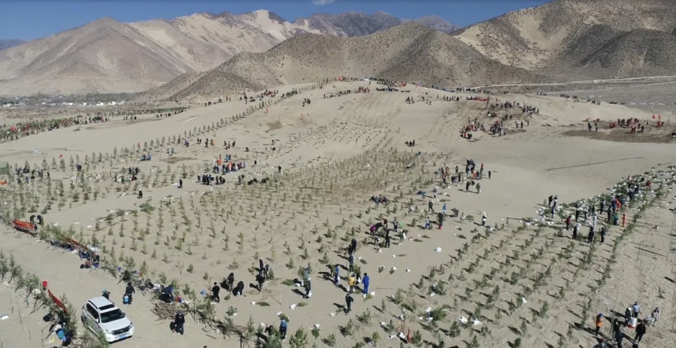 彼時的雅江中游河畔是一片土地沙化嚴(yán)重、風(fēng)沙肆虐的荒蕪之地。據(jù)原山南地區(qū)林業(yè)局局長李純祿回憶:離江較近的農(nóng)田風(fēng)蝕嚴(yán)重,有的地塊一年要重播兩三次。附近草場沙化嚴(yán)重。有時沙塵暴卷起的揚沙達(dá)數(shù)十米甚至數(shù)百米之高,遮天蔽日,天昏地暗。