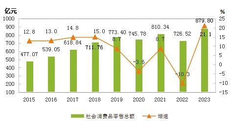 全年社會消費(fèi)品零售總額879.80億元,比上年增長21.1%。按銷售單位所在地分,城鎮(zhèn)消費(fèi)品零售額716.67億元,增長19.5%;鄉(xiāng)村消費(fèi)品零售額163.14億元,增長28.8%。按消費(fèi)形態(tài)分,商品零售789.54億元,增長19.9%;餐飲收入90.27億元,增長32.4%。