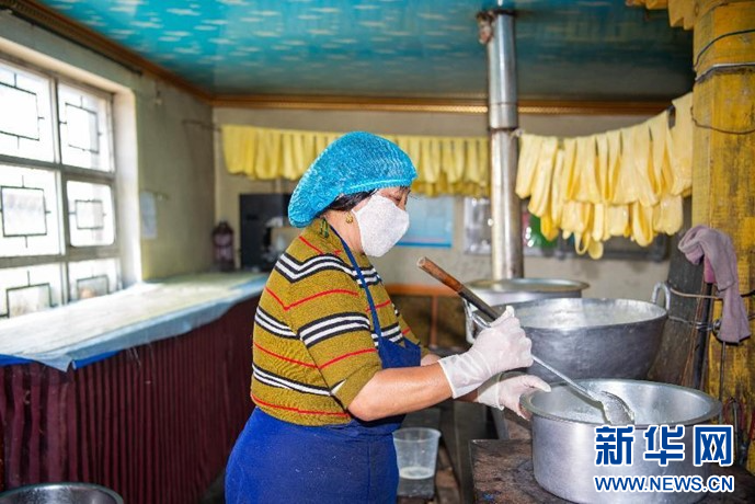 8月21日拍攝的傳統(tǒng)工廠里的工人正在熬煮牛奶。新華網 旦增努布攝