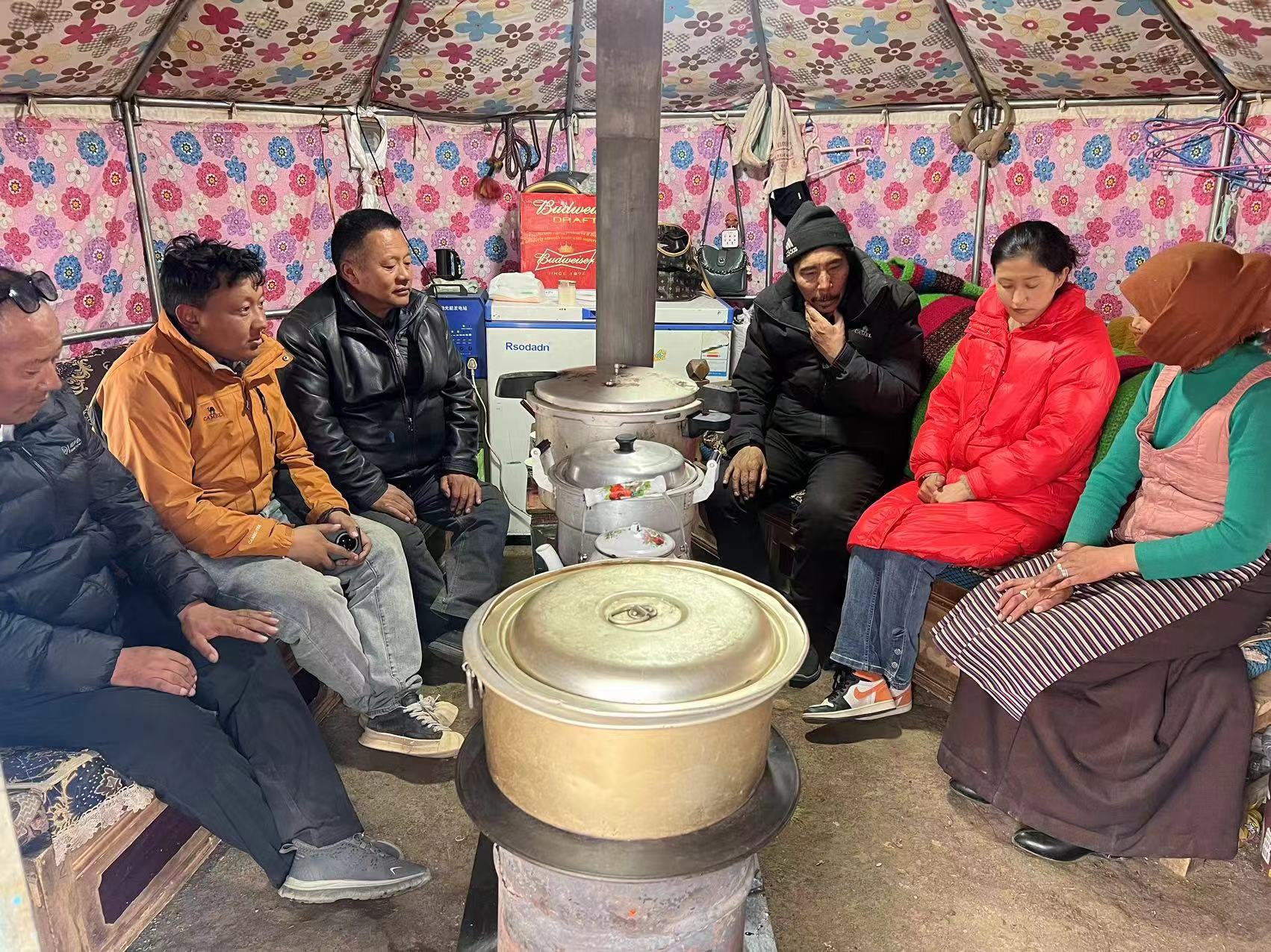 圖為格桑西珠(左三)深入牧戶家中,傾聽群眾所思所想。