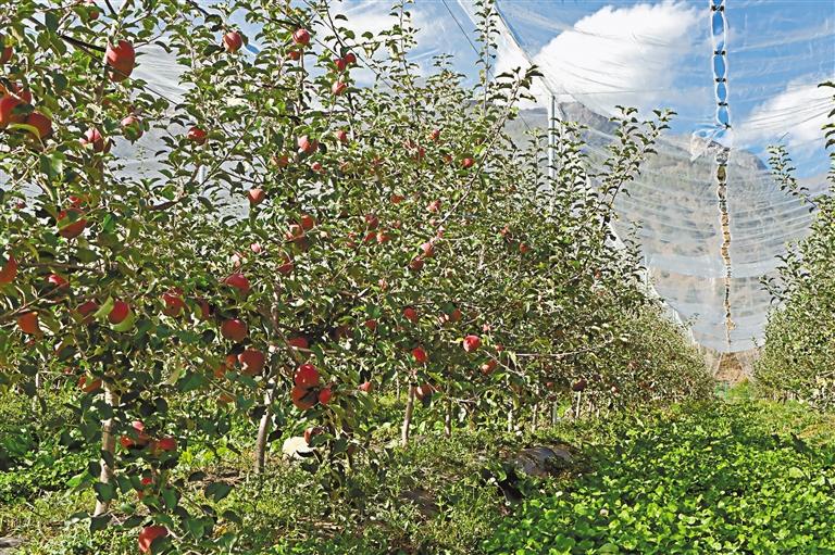 定睛一看,這里的蘋果生長環(huán)境確實不一般——蘋果樹住進了配有“網(wǎng)帳”的“小區(qū)”。