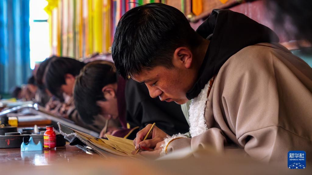 11月22日,昌都市丁青縣擁忠文化藝術(shù)中心非遺扶貧就業(yè)工坊學(xué)員在練習(xí)藏文書(shū)法。新華社記者 普布次仁 攝