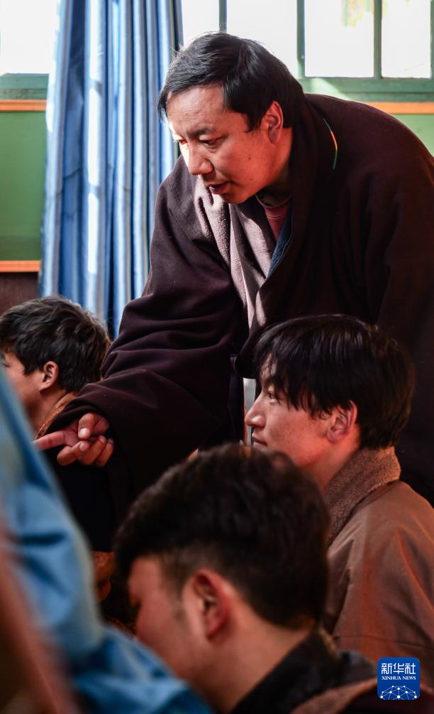 11月22日,昌都市丁青縣擁忠文化藝術(shù)中心非遺扶貧就業(yè)工坊老師在指導(dǎo)學(xué)員寫(xiě)藏文書(shū)法。新華社記者 格桑朗杰 攝