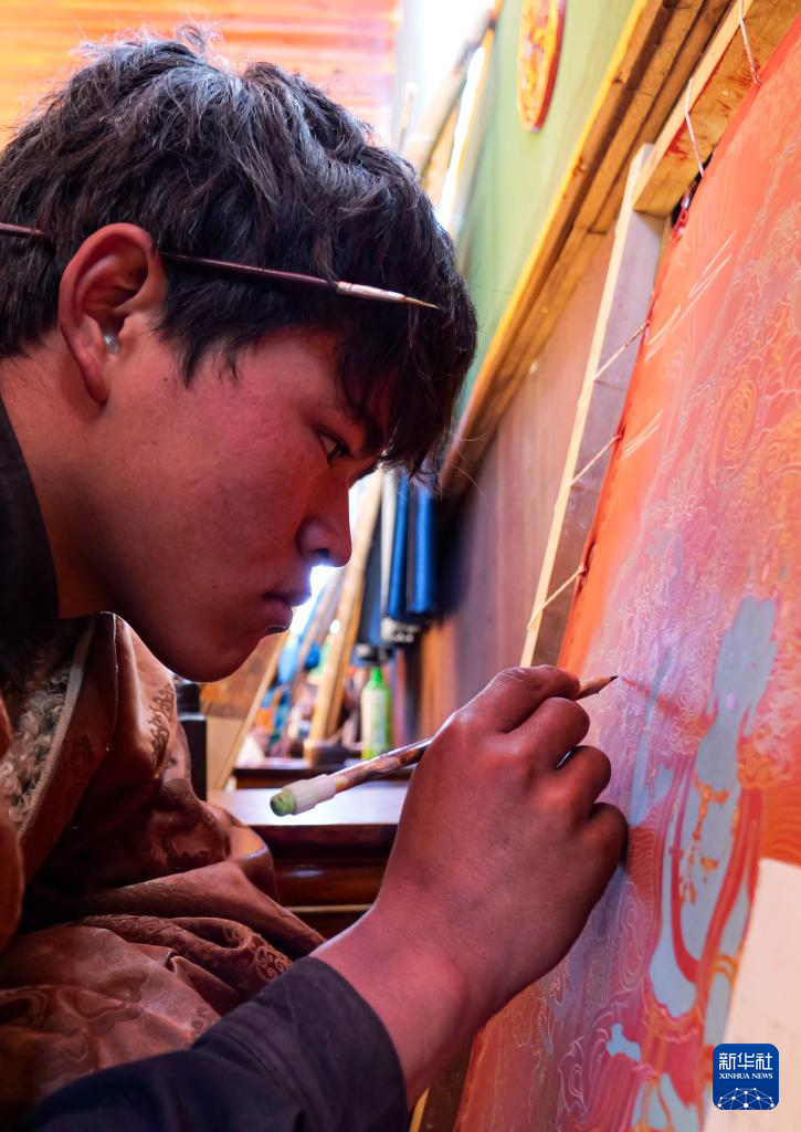 11月22日,昌都市丁青縣擁忠文化藝術(shù)中心非遺扶貧就業(yè)工坊學(xué)員在畫(huà)唐卡。新華社記者 格桑朗杰 攝