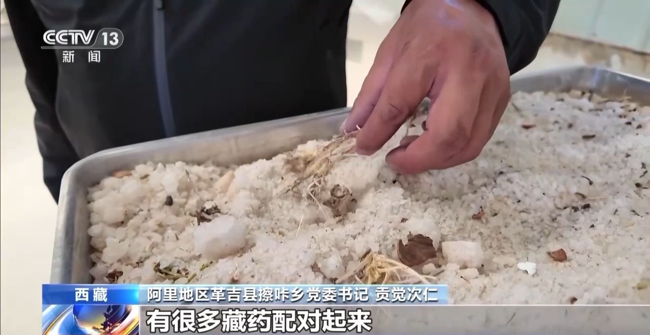 阿里地區(qū)革吉縣擦咔鄉(xiāng)黨委書記 貢覺(jué)次仁:這個(gè)就是足療鹽的原料,除了鹽以外還有很多藏藥,將原料先做初步的粉碎,然后進(jìn)行混合,最后磨成跟面粉一樣。
