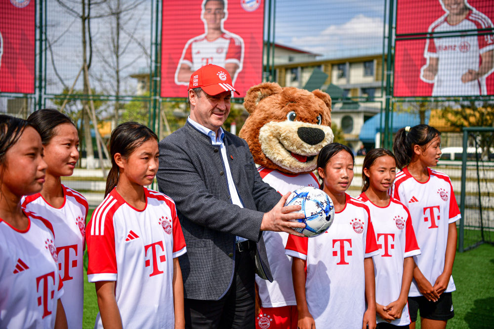 德國(guó)巴伐利亞州州長(zhǎng)索德爾(左四)在位于成都市武侯區(qū)的阿迪達(dá)斯20號(hào)體育公園觀摩了一場(chǎng)中國(guó)少年女子足球隊(duì)的訓(xùn)練賽。新華社記者張超群攝