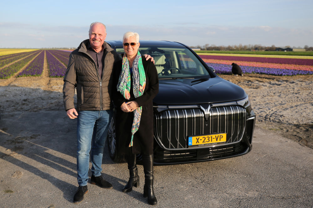 3月25日,荷蘭消費(fèi)者埃里克·贊德貝亨和他的妻子埃倫在嵐圖汽車(chē)前合影。新華社記者趙丁喆攝
