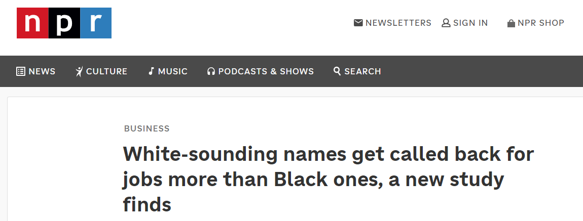 據(jù)美國(guó)全國(guó)公共廣播電臺(tái)(NPR)網(wǎng)站報(bào)道,研究人員向約100家美國(guó)企業(yè)的11000個(gè)初級(jí)職位投遞了履歷相同,但個(gè)人信息(姓名、性別等)不同的83000份“偽造”簡(jiǎn)歷。研究發(fā)現(xiàn),名字聽起來(lái)“像白人”的求職者被招聘方回復(fù)的概率更高,比名字“像黑人”的求職者平均高9.5%。在一些情況更嚴(yán)重的企業(yè),這一差距上升到約24%。