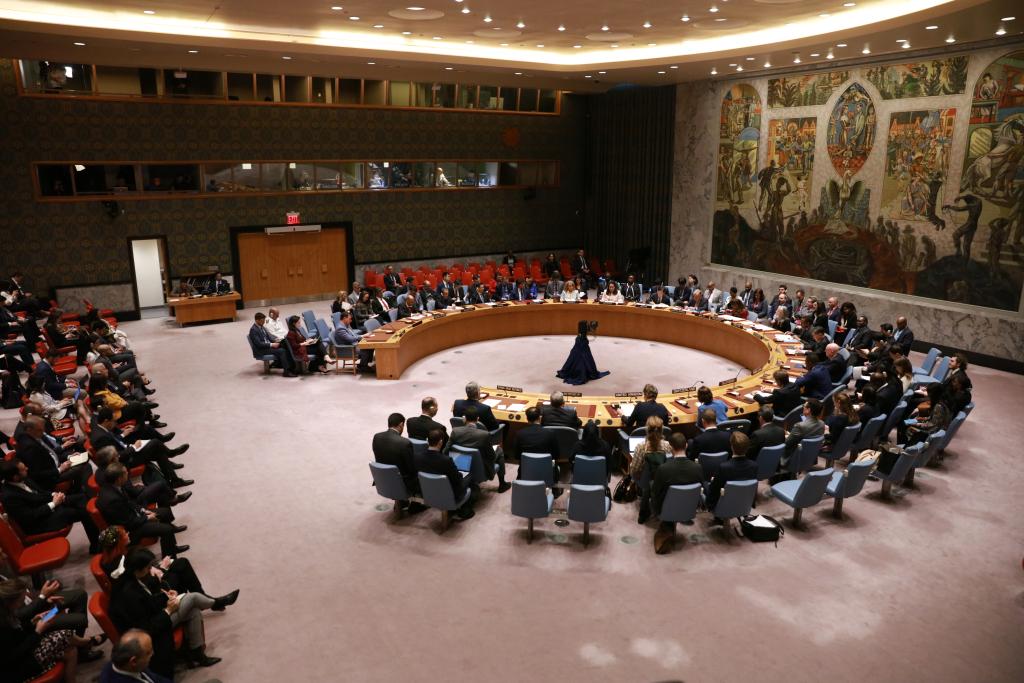 4月14日,在位于紐約的聯(lián)合國(guó)總部,聯(lián)合國(guó)安理會(huì)就伊朗襲擊以色列舉行緊急會(huì)議。新華社記者謝鍔攝
