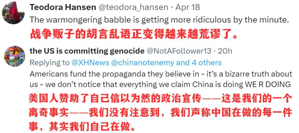 脫口秀播發(fā)后,英國(guó)議會(huì)議員喬治·加洛韋、倫敦廣播公司主持人丹尼絲·黑德利、倫敦都市大學(xué)副教授康斯坦丁諾斯·皮塔基、美國(guó)反戰(zhàn)組織“粉色代碼”等機(jī)構(gòu)和個(gè)人賬號(hào)紛紛轉(zhuǎn)贊評(píng)。網(wǎng)友們?cè)谠u(píng)論區(qū)呼吁:這樣有趣又有料的節(jié)目,多多益善!