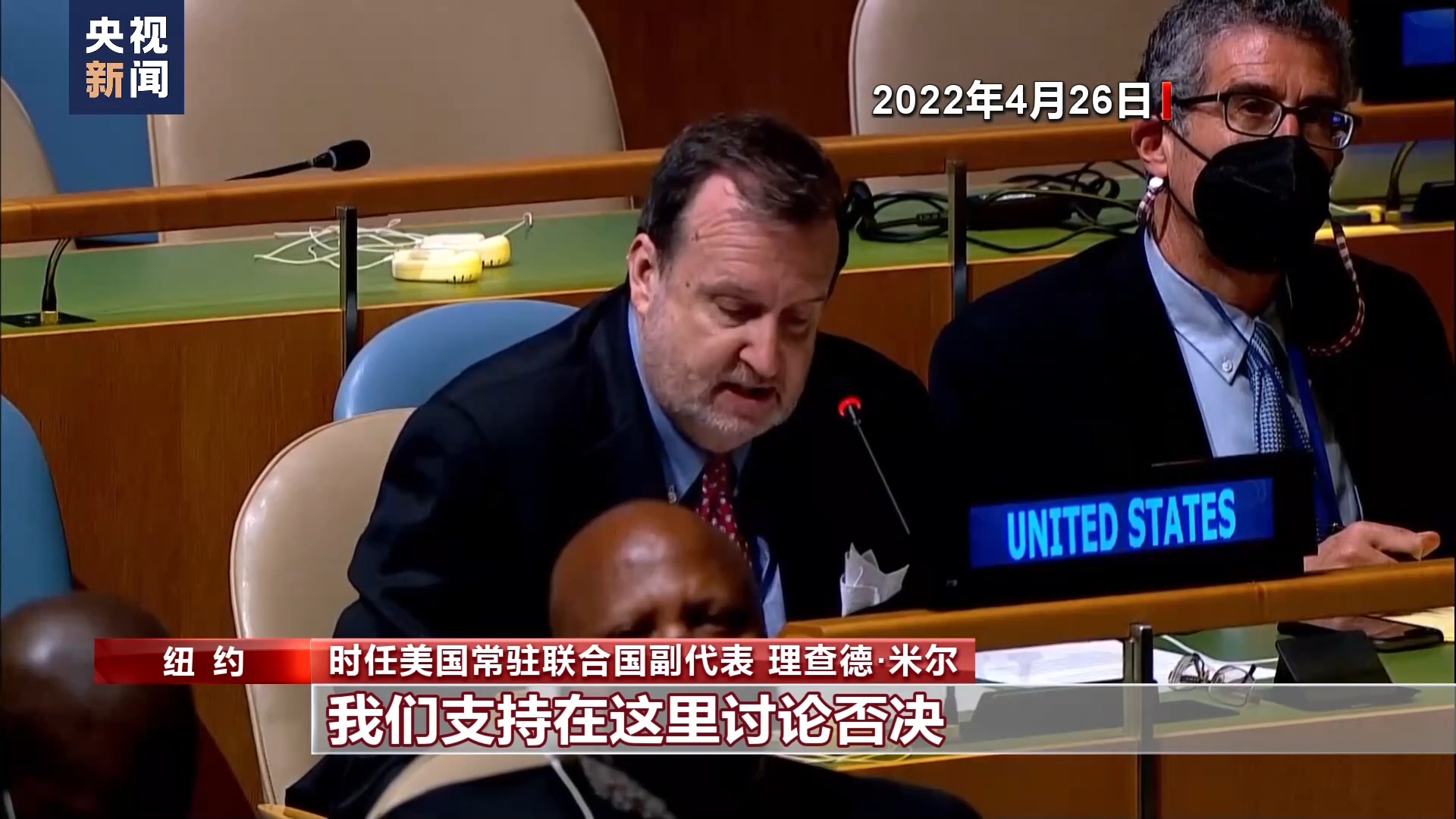 央視記者 徐德智:我們知道所謂聯(lián)大“否決倡議”,是在2022年4月通過(guò)的名為“在安全理事會(huì)發(fā)生投否決票情況時(shí)進(jìn)行大會(huì)辯論的長(zhǎng)期授權(quán)”的決議。當(dāng)時(shí)俄烏沖突爆發(fā),安理會(huì)關(guān)于烏克蘭決議幾乎都會(huì)被俄羅斯否決,于是美國(guó)支持了這個(gè)“要求安理會(huì)決議否決國(guó)家必須到聯(lián)大解釋原因”的提案。當(dāng)年美國(guó)代表團(tuán)可不是這么說(shuō)的。