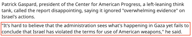 “報(bào)告中確實(shí)說(shuō),可以合理認(rèn)定以色列在違反國(guó)際人道主義法的行動(dòng)中使用了美制武器,但報(bào)告卻不明確說(shuō)以色列違反了國(guó)際人道主義法?!?/p>