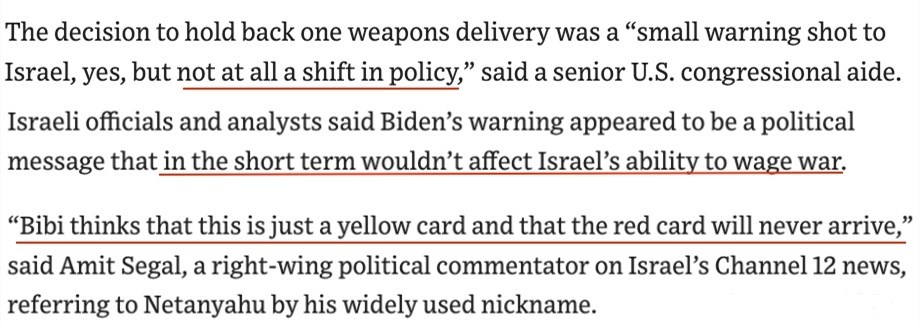 “比比(內(nèi)塔尼亞胡的昵稱(chēng))相信拜登只是對(duì)他亮出了一張黃牌,而紅牌永遠(yuǎn)不會(huì)到來(lái)?!?/p>