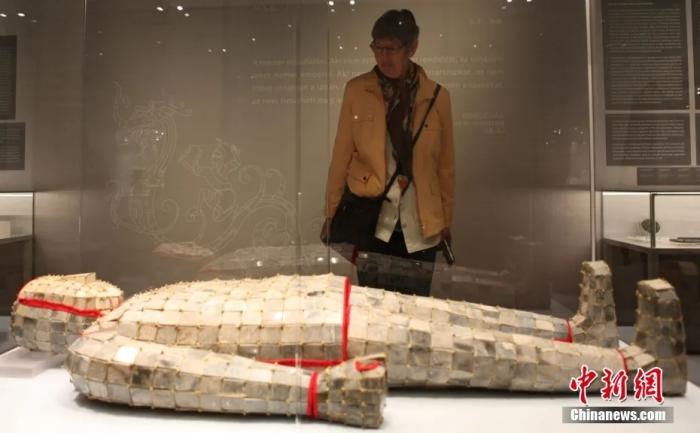 在匈牙利古都塞克什白堡舉行的“不朽的玉甲—中國漢代文物精品展”,共展出百余件玉器、漆器、陶器、青銅器、印章、石刻、錢幣等漢代文物,將漢代政治經(jīng)濟、社會生活、文化藝術和禮儀信仰逐一呈現(xiàn)。圖為當?shù)貢r間5月7日,一名觀眾駐足細觀徐州博物館鎮(zhèn)館之寶西漢金縷玉衣。中新社記者 德永健 攝