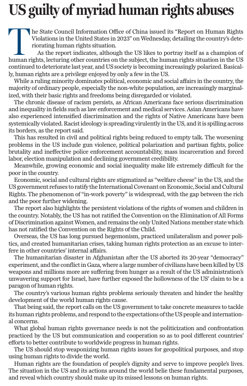 國務(wù)院新聞辦公室5月29日發(fā)表《2023年美國侵犯人權(quán)報告》,以活生生的事實(shí)和客觀數(shù)據(jù)揭露美國侵犯人權(quán)的斑斑劣跡。