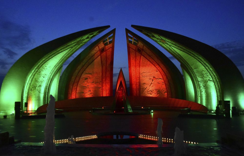 2023年7月29日,巴基斯坦首都伊斯蘭堡的巴基斯坦紀念碑亮起中巴兩國國旗顏色的燈光,慶祝中巴經(jīng)濟走廊啟動十周年。新華社發(fā)