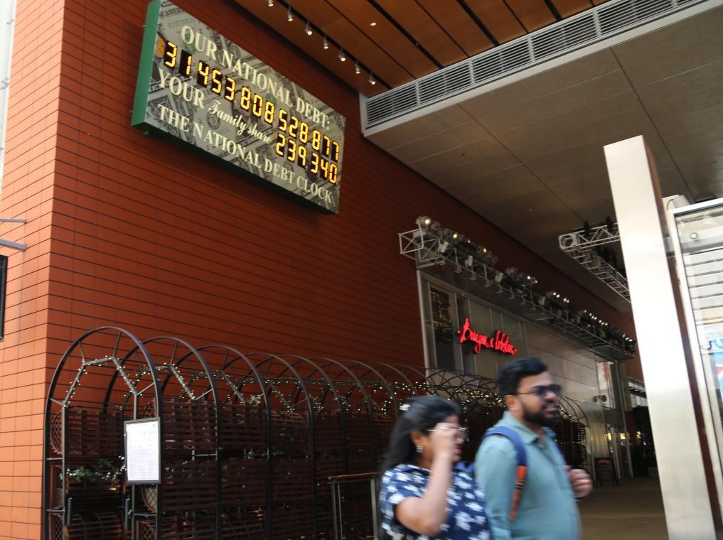 2023年5月29日,人們經(jīng)過美國紐約曼哈頓的“國債鐘”。“國債鐘”是一個大型計數(shù)器,它實時更新美國的公共債務總額,并顯示出每個美國家庭所要負擔的數(shù)額。新華社記者劉亞南攝