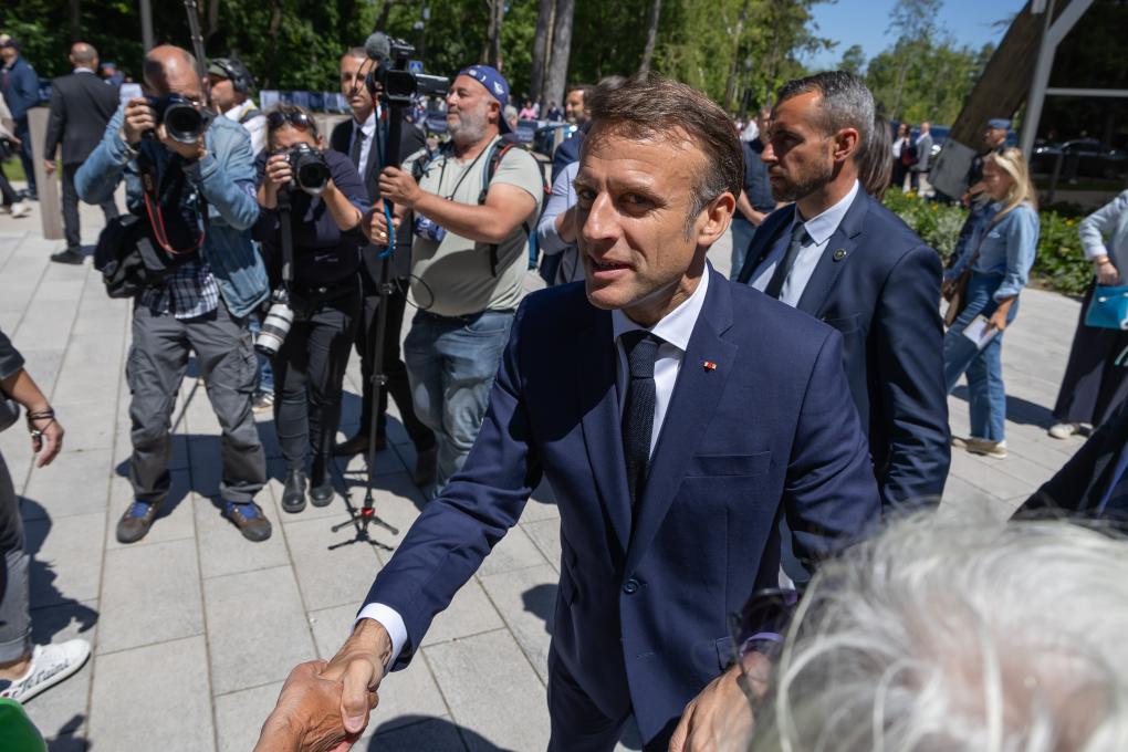 6月9日,在法國(guó)勒?qǐng)D凱市一處投票站外,法國(guó)總統(tǒng)馬克龍(右二)在參加歐洲議會(huì)選舉投票前與民眾交流。新華社發(fā)(弗蘭克·博阿姆攝)
