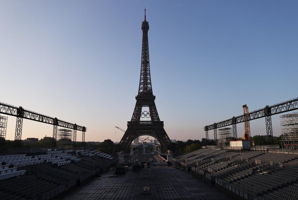 這是6月7日清晨在法國(guó)巴黎拍攝的懸掛奧運(yùn)五環(huán)標(biāo)志的埃菲爾鐵塔以及正在搭建看臺(tái)的特羅卡德羅廣場(chǎng),巴黎奧運(yùn)會(huì)開(kāi)幕式的慶?;顒?dòng)將在這里舉行。 新華社記者高靜攝