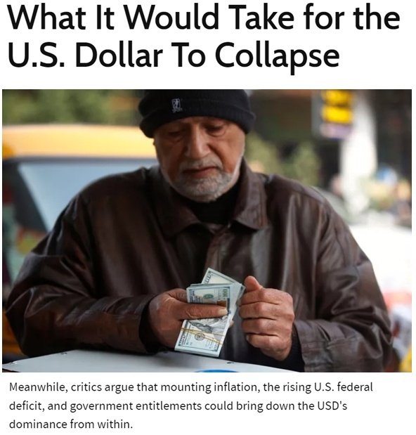 有美國(guó)金融新聞網(wǎng)評(píng)論稱,不斷加劇的通貨膨脹、不斷上升的美國(guó)聯(lián)邦赤字和政府福利可能會(huì)從內(nèi)部削弱美元在全球金融體系的主導(dǎo)地位。