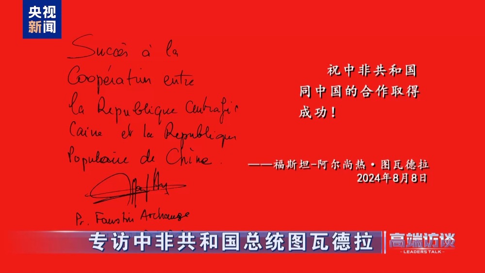 △中非總統(tǒng)圖瓦德拉在接受總臺(tái)專訪后題詞
