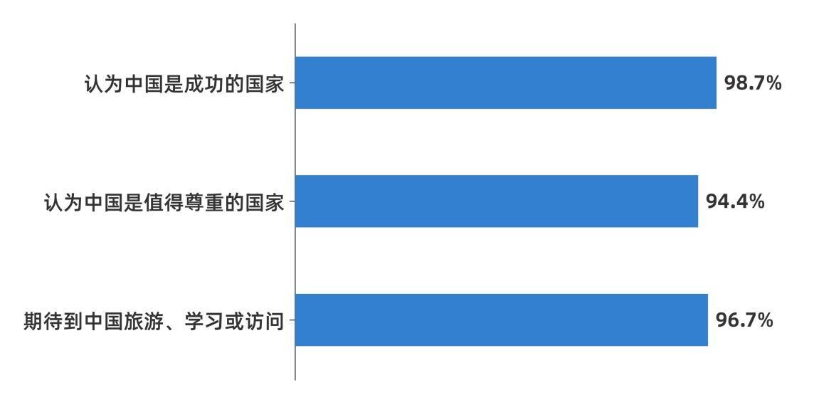 調(diào)查發(fā)現(xiàn),受訪青年普遍有極高的對華好感度。在對華總體印象的系列認(rèn)知中,高達98.7%的受訪青年認(rèn)為中國是一個成功的國家;94.4%的受訪青年認(rèn)為中國是一個值得尊重的國家;96.7%的受訪青年期待未來有機會來到中國旅游、學(xué)習(xí)或訪問。