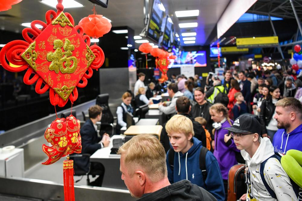 9月28日,在俄羅斯韃靼斯坦共和國(guó)喀山國(guó)際機(jī)場(chǎng),搭乘喀山至上海直飛航班的乘客辦理值機(jī)。新華社記者曹陽攝