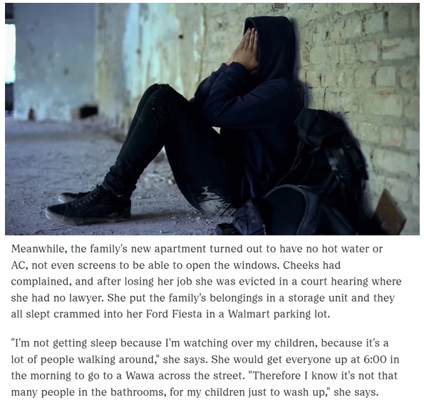 在弗吉尼亞州生活的奇克斯是一位獨自撫養(yǎng)四個孩子的母親。由于失業(yè)后無力負擔房租,她和四個孩子的臨時住房是一輛小轎車,這輛車長期停在一家超市的停車場里。