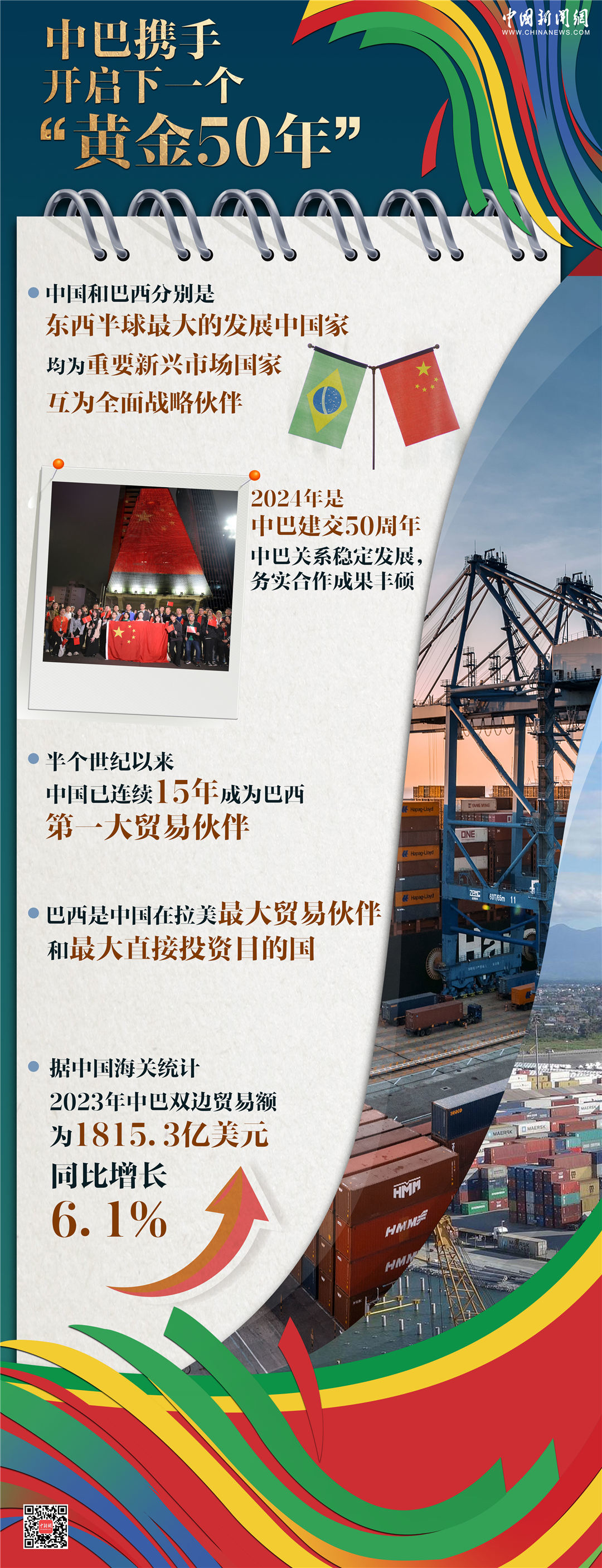 “中國(guó)和巴西同為發(fā)展中大國(guó)和重要新興市場(chǎng)國(guó)家,是志同道合的好朋友、攜手前行的好伙伴?!?024年8月15日,習(xí)近平主席同巴西總統(tǒng)盧拉互致賀電,慶祝兩國(guó)建交50周年。