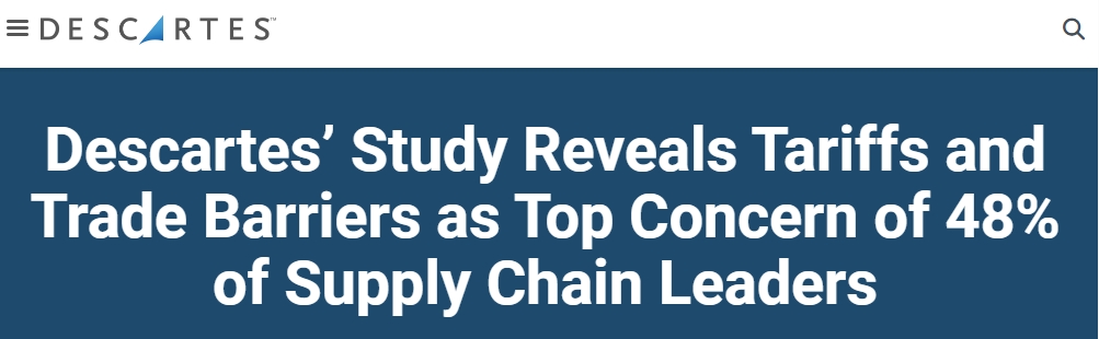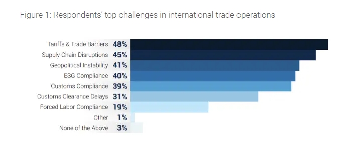 調查顯示,48%的受訪者認為關稅和貿易壁壘上升是他們最擔心的問題,緊隨其后的是供應鏈中斷(45%)和地緣政治不穩(wěn)定(41%)。此外,無論所在公司規(guī)模大小,受訪者都將關稅和貿易壁壘列為當前面臨的首要問題。這項報告共調查了978名來自歐洲、北美、南美和亞太地區(qū)主要貿易國的供應鏈領域領導者。