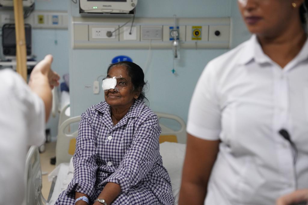 這是2024年12月24日在斯里蘭卡科倫坡港??康闹袊\姟昂推椒街邸碧栣t(yī)院船上拍攝的剛進行完白內障手術的本地患者。(新華社記者伍岳攝)