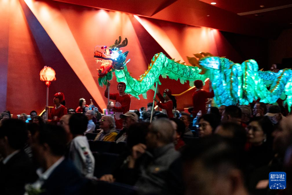 1月26日,演員在美國休斯敦“擁抱春天”春節(jié)聯(lián)歡晚會(huì)現(xiàn)場舞龍。新華社發(fā)(陳晨攝)