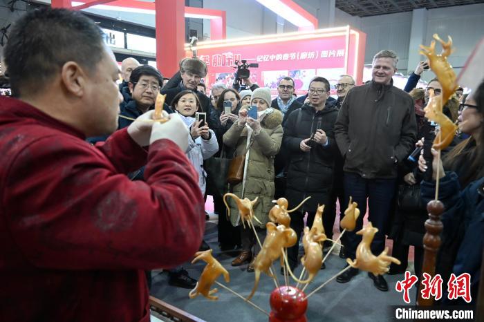 2月7日,多位駐華使節(jié)在廊坊國際年貨節(jié)上被吹糖人技藝吸引。中新社記者 翟羽佳 攝