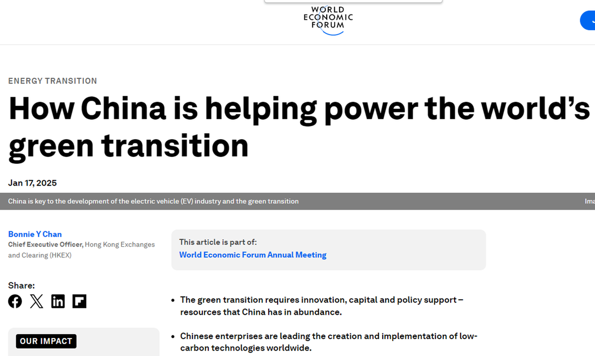 世界經(jīng)濟(jì)論壇網(wǎng)站題為《中國(guó)助力全球綠色轉(zhuǎn)型》的文章強(qiáng)調(diào),中國(guó)在推動(dòng)全球綠色轉(zhuǎn)型過(guò)程中具有關(guān)鍵作用,特別是在電動(dòng)車、可再生能源及低碳技術(shù)領(lǐng)域。
