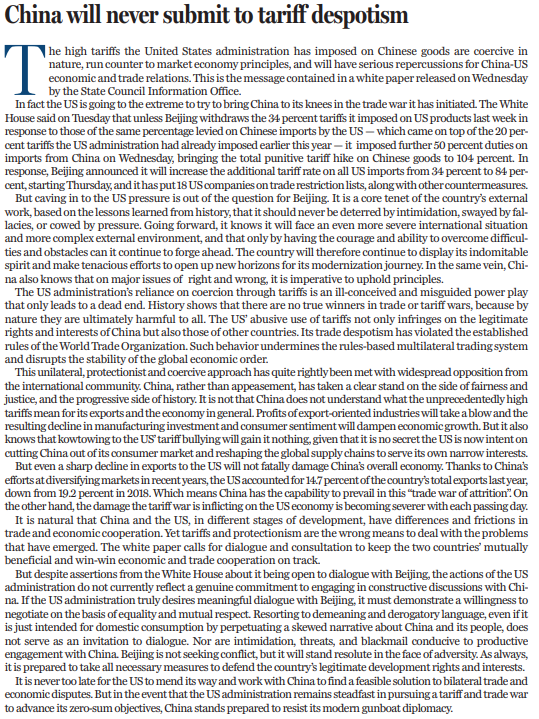 本周三,國務院新聞辦公室發(fā)布《關于中美經(jīng)貿(mào)關系若干問題的中方立場》白皮書。白皮書指出,美國政府對中國輸美商品征收高額關稅是要挾,違背市場經(jīng)濟規(guī)律,將對中美經(jīng)貿(mào)關系產(chǎn)生嚴重影響。