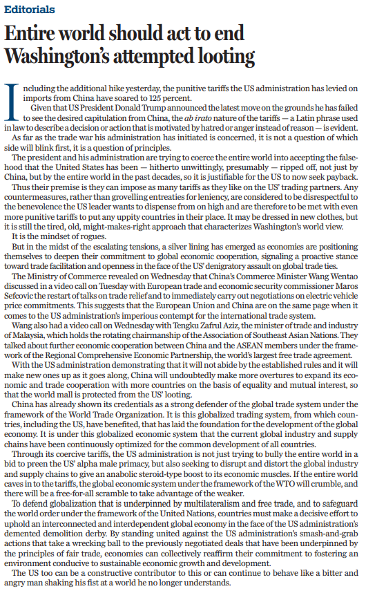 美國政府試圖脅迫全世界接受這樣一個(gè)謊言,即美國在過去幾十年中不僅被中國,而且被整個(gè)世界所欺騙,因此美國現(xiàn)在加征關(guān)稅是理所當(dāng)然的。其他國家如果不卑躬屈膝地請求“寬大處理”,甚至采取反制措施,就會被視為對美方大不敬,美國將加以更高的懲罰性關(guān)稅,迫使敢于反抗的國家俯首稱臣。華盛頓的世界觀也許披上了新衣,但仍然是老套的“強(qiáng)權(quán)即公理”,完全是流氓心態(tài)和強(qiáng)盜邏輯。