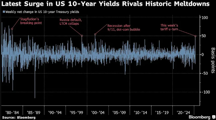 行情數據顯示,截止本周五收盤,素有“全球資產定價之錨”之稱10年期美債收益率已創(chuàng)下了逾20年來的最大單周漲幅(收益率與債券價格反向),因投資者持續(xù)撤出美國資產。