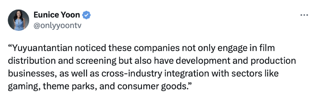 美媒的一位記者還專門在社交媒體上援引玉淵譚天的觀點說,由于美國文化產(chǎn)業(yè)的核心盈利點確實在于知識產(chǎn)權(quán)和品牌價值。因此,如果中國消費者開始在電影領(lǐng)域?qū)γ绹a(chǎn)品“降溫”,這種趨勢很可能會進(jìn)一步外溢,影響到其他依賴美國IP和品牌溢價的行業(yè)。