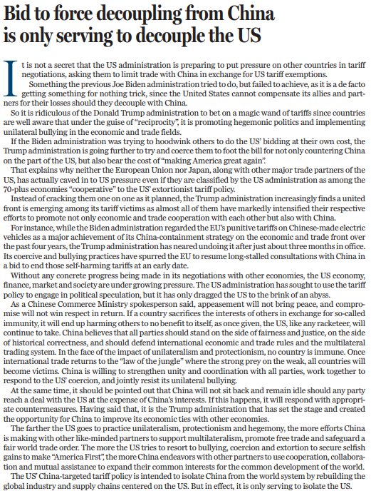 如中國商務部新聞發(fā)言人所說,綏靖換不來和平,妥協(xié)也得不到尊重。為一己一時私利,以損害別人利益來換取所謂豁免是與虎謀皮,最終只能是兩頭落空,損人不利己。中方認為,各方在“對等關(guān)稅”問題上應站在公平正義的一邊,應站在歷史正確的一邊,應捍衛(wèi)國際經(jīng)貿(mào)規(guī)則和多邊貿(mào)易體制。面對單邊主義和保護主義沖擊,誰都無法獨善其身。國際貿(mào)易一旦回歸弱肉強食的“叢林法則”,所有國家都會淪為受害者。中方愿與各方加強團結(jié)協(xié)調(diào),攜手應對,共同抵制單邊霸凌行徑,維護自身正當權(quán)益,捍衛(wèi)國際公平正義。