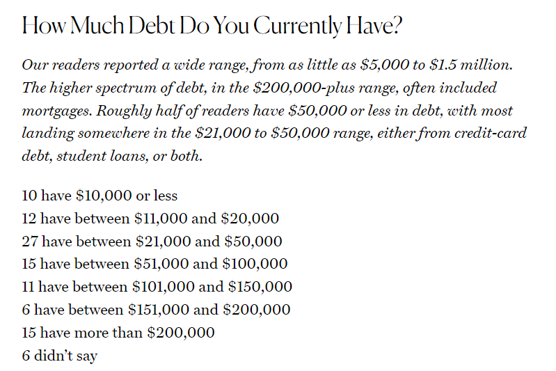 該網(wǎng)站針對(duì)102名讀者就個(gè)人債務(wù)問題進(jìn)行了調(diào)查,了解他們?nèi)绾伪池?fù)和償還債務(wù)。調(diào)查發(fā)現(xiàn),個(gè)人債務(wù)總額從5000美元到150萬美元不等,20萬美元以上的債務(wù)通常包含抵押貸款。約半數(shù)受訪者的債務(wù)在5萬美元及以下,最常見的債務(wù)范圍在2.1萬美元至5萬美元之間。