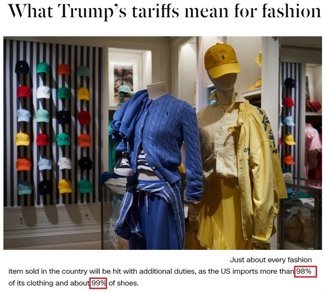 美國有線電視新聞網(wǎng)近日刊發(fā)文章指出,關(guān)稅政策對服裝行業(yè)的影響尤為嚴重,因為美國人衣櫥里98%的衣物和99%的鞋子都是進口的。