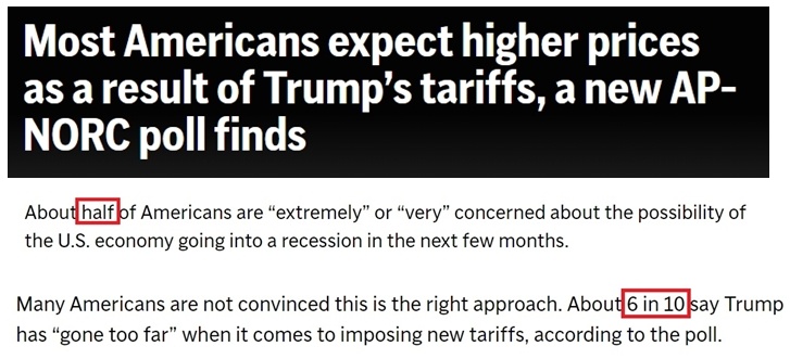 對于特朗普政府的關(guān)稅政策,近六成的受訪者認為政府“做得太過了”。另外,約有一半受訪者“極度”或“非?!睋拿绹?jīng)濟會在未來幾個月陷入衰退。