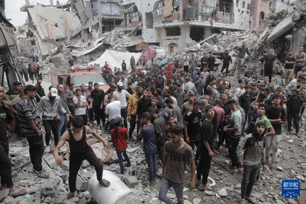 5月15日,在加沙地帶北部杰巴利耶難民營,人們?cè)谝攒娹Z炸后開展救援。新華社發(fā)(阿卜杜勒·拉赫曼·薩拉馬攝)