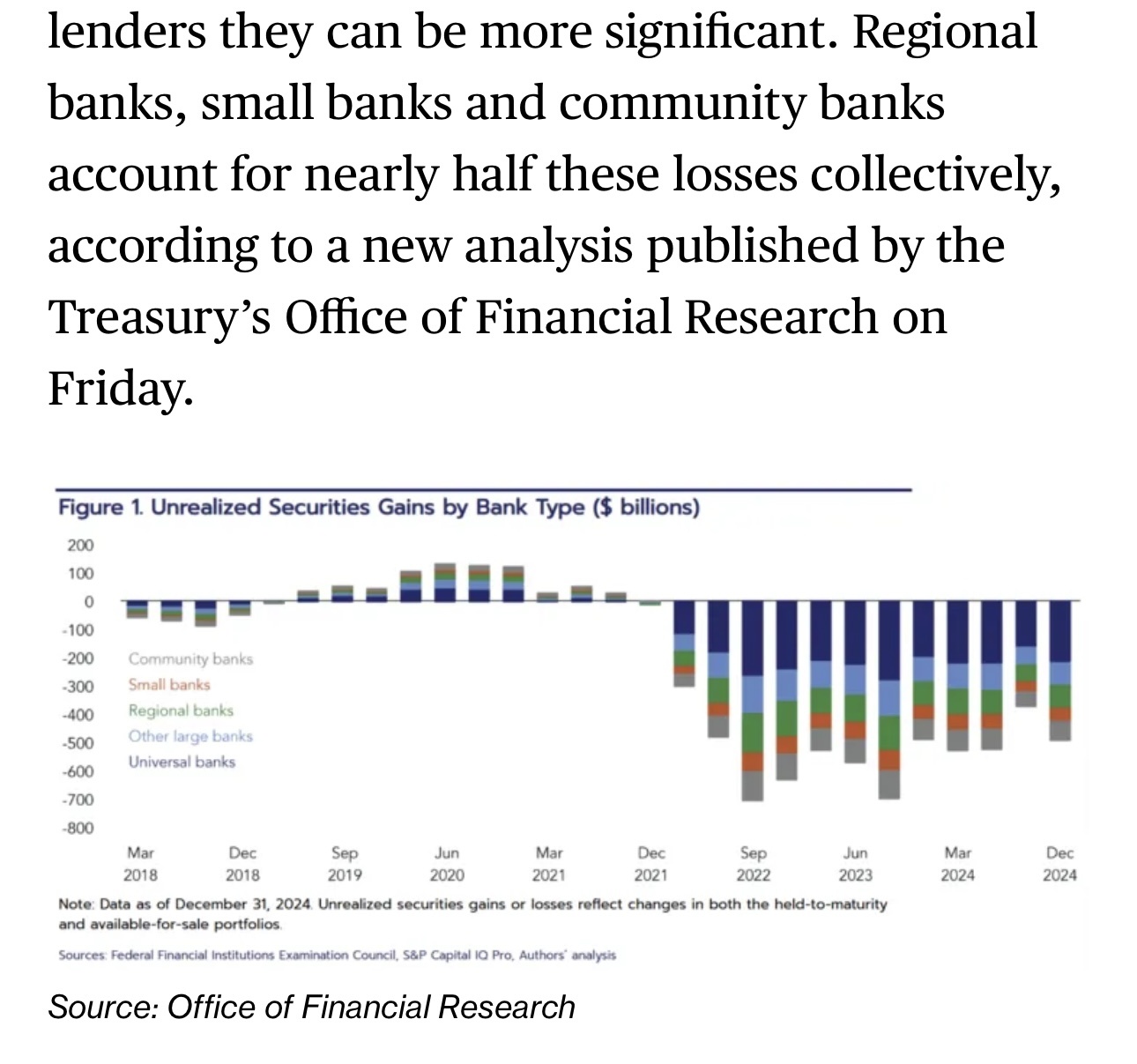 根據(jù)美國聯(lián)邦存款保險公司的最新季度數(shù)據(jù),2024年第四季度,美國銀行債券持有的“未實現(xiàn)損失”總額進(jìn)一步擴(kuò)大,達(dá)到4820億美元,自9月底以來增加了1180億美元。而根據(jù)美國財政部金融研究辦公室此前發(fā)布的一份報告,地區(qū)性銀行、小型銀行和社區(qū)銀行共同承擔(dān)了這些損失的近一半。