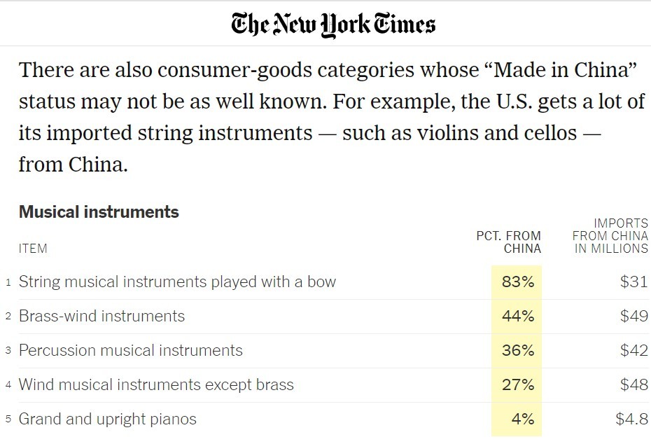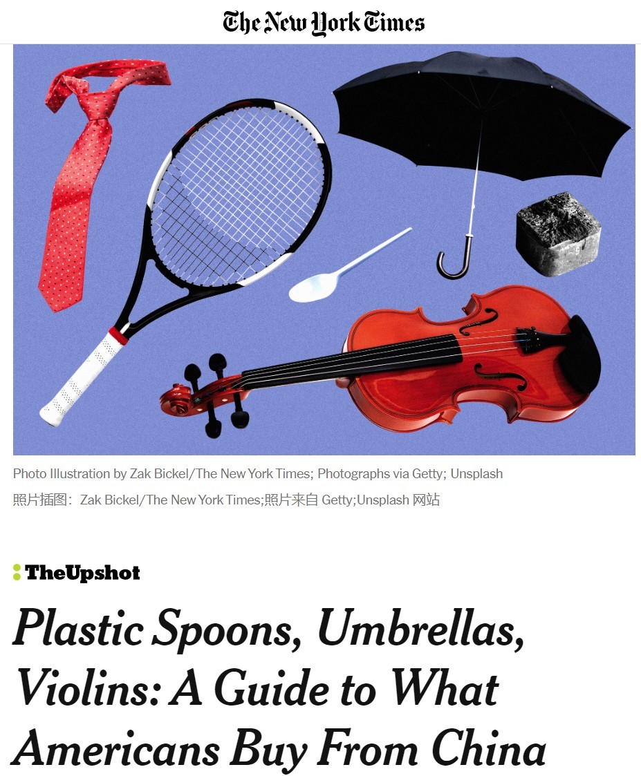 文章說,從清單中可以看出,美國從中國進口的主要商品都是消費品,覆蓋生活中的多個場景:你衣櫥中的領(lǐng)帶、手套和連褲襪幾乎都是從中國進口的;如果你是一名運動員,尤其是球類運動的運動員,那么你用的羽毛球、乒乓球、網(wǎng)球、健身房設(shè)備、泳池設(shè)備等都非常依賴“中國制造”;還有一些消費品類別的“中國制造”可能不那么廣為人知。例如,美國從中國進口了大量弦樂器,包括小提琴和大提琴。維生素及其衍生物也大量從中國進口,還有各種冷凍魚類,包括鰻魚、鱈魚、羅非魚等等。