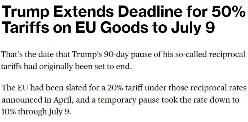 他25日告訴記者,自己當(dāng)天與歐盟委員會(huì)主席馮德萊恩“愉快”地通了電話(huà),并應(yīng)對(duì)方要求,決定將原計(jì)劃從6月1日開(kāi)始對(duì)歐盟加征的50%的關(guān)稅推遲到7月9日,以便雙方有時(shí)間就此進(jìn)行談判。