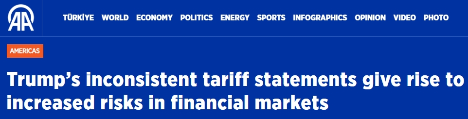 土耳其阿納多盧通訊社(Anadolu Ajans )27日的報(bào)道指出,美國政府在關(guān)稅問題上前后不一的言論和難以預(yù)測的行動(dòng),導(dǎo)致全球金融市場風(fēng)險(xiǎn)加大、波動(dòng)加劇,包括最近針對(duì)歐盟所作的決定。