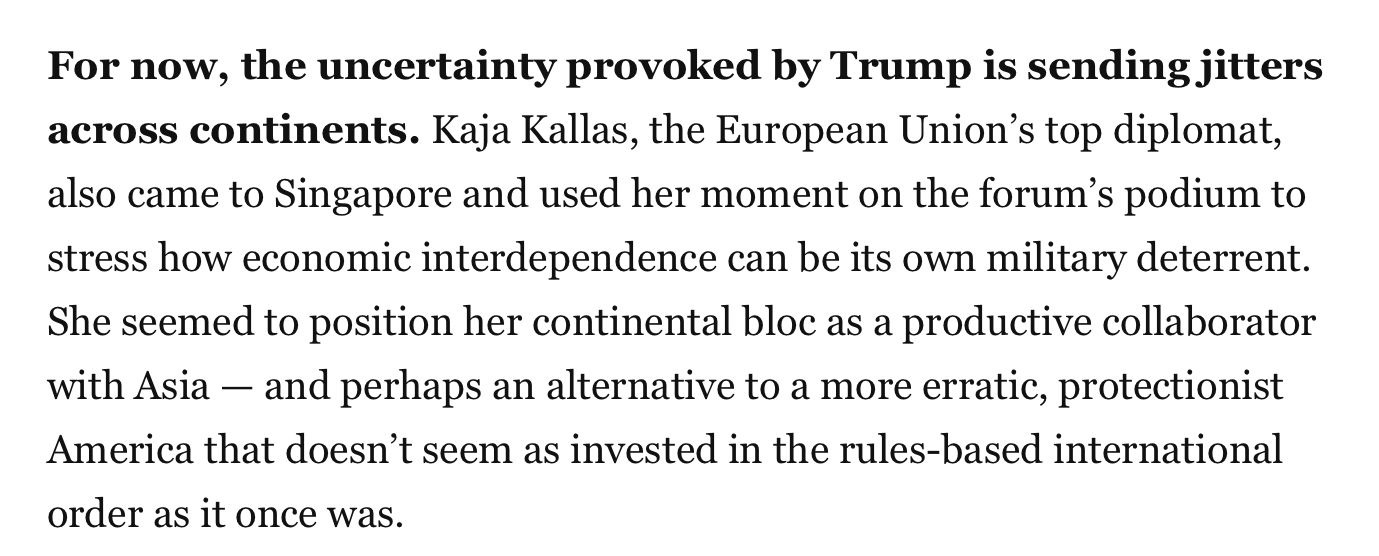 《華盛頓郵報(bào)》的一篇文章則通過香格里拉對(duì)話會(huì)觀察到,美國(guó)政府濫施關(guān)稅引發(fā)的不確定性,正讓各大洲陷入不安。