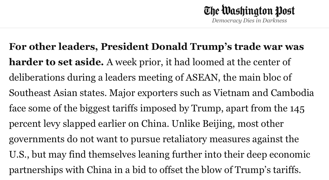 文章說,盡管大多數(shù)亞洲國(guó)家的政府沒有對(duì)美國(guó)采取反制措施,但它們都更傾向于進(jìn)一步鞏固與中國(guó)的深厚經(jīng)濟(jì)伙伴關(guān)系,以抵消美國(guó)關(guān)稅帶來(lái)的沖擊。
