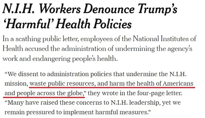 近日,NIH近百名現(xiàn)任和新近被解職的職員發(fā)表聯(lián)名信,批評美國現(xiàn)政府“有害”的衛(wèi)生政策危害美國和全球人民的健康,將科學(xué)研究政治化并浪費公共資源。